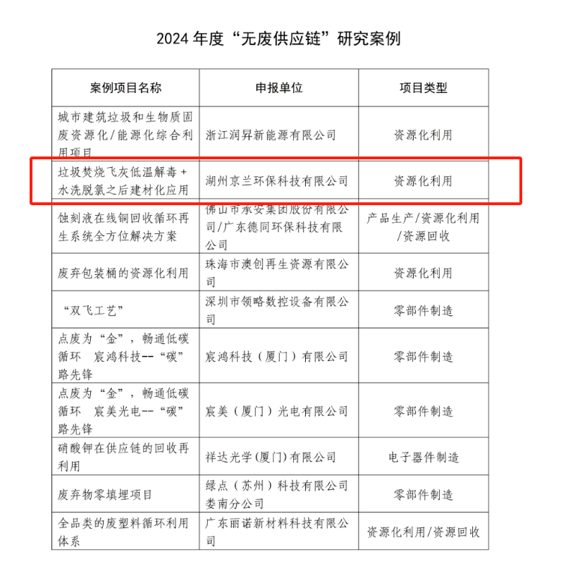 根據(jù)案例研究及匯報(bào)情況,本年度評選出10項(xiàng)“無廢供應(yīng)鏈”評價(jià)試點(diǎn)及10項(xiàng)“無廢供應(yīng)鏈”研究案例。湖州京蘭環(huán)??萍加邢薰緫{借 “垃圾焚燒飛灰低溫解毒 + 水洗脫氯之后建材化應(yīng)用” 項(xiàng)目脫穎而出,成功入選 “無廢供應(yīng)鏈” 研究案例。